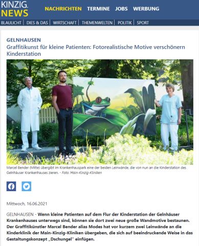 Der Artikel der Kinzig News findet sich unter: https://kinzig.news/12415/graffitikunst-fuer-kleine-patienten-fotorealistische-motive-verschoenern-kinderstation