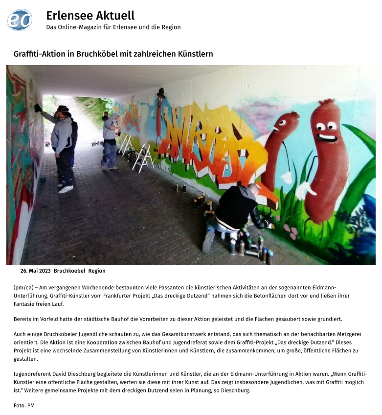 Erlensee Aktuell berichtete: https://www.erlensee-aktuell.com/2023/05/26/graffiti-aktion-in-bruchkoebel-mit-zahlreichen-kuenstlern/